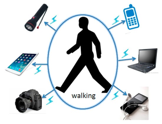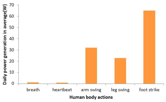 Energy is a basic need in human life, and people are consuming more and more energy for doing their activities with the emergence of home appliances and wearable electronics [,]. The human body contains enormous amounts of energy produced by metabolism and is a promising energy source to harvest. Potential in power generation due to typical types of movements performed daily by a commonplace human body with a medium build is illustrated in Figure 1 [,]. Generally, the major energy provided by the human body results from limb movement, heat, and biochemical potentials. Among these three types of energy sources, body motion produces the most. It is estimated that energy generated by these sources is as considerable as capable of powering computers and other electronics indispensable in modern daily life [].