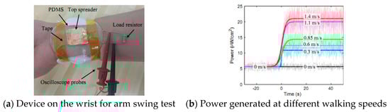Harvesting energy available in vivo, such as the biochemical energy in bio-fluid, is relatively difficult, and the output power signal is weak []. On the other hand, a thermoelectric generator can be used to get electric energy from human body heat. The recent achievements on various applications of thermoelectric devices have been made promisingly. As shown in Figure 2, an energy harvesting test with a thin layer of polydimethylsiloxane (PDMS) spread on a wrist conducted at a room temperature of 17.2 °C proved that power of more than 10 μW/cm2 could be generated at a normal walking speed, and it can spread across various body locations additionally []. Although energy produced either by harvesting on clothes or taping the device directly to the skin is only several micro Watts, it proves to be a reliable power supply for low-power wearable electronics like wireless electrocardiography [,]. However, it has to cover more area of the human body in order to obtain more output power, which may make people feel uncomfortable.