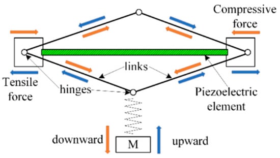 Due to its advantages of simple architecture, piezoelectric materials are easy to fabricate into energy harvesters of different configurations []. It is quite suitable for harvesting energy from the compression motion performed by foot strike. So, embedding such harvesters into insole is the most common way to harvest human walking induced energy []. In practice, the effective deformation of the piezoelectric material is relatively small when the human foot strikes directly, and the amount of electricity generated is very limited. In order to improve the output power of such insole harvesters, amplification mechanisms were proposed to increase the effective strain in the piezoelectric material, as shown in Figure 3 []. With novel amplification mechanisms, the effective strain can be greatly improved, and the output electric power is much more than the harvester of traditional constructions []. It is reported that the magnetic rotary generator can produce approximately two orders of magnitude more power than either of the piezoelectric systems [,,]. However, in contrast with traditional generators, the harvester with smart material is much easier to integrate smoothly into the design of common footwear without much interference to the shoe or gait [].