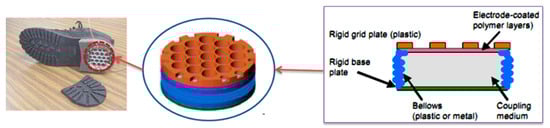 The foot striking action leads to the relative movement between the feet and ground. It makes the possibility of using a compact generator to harvest energy. For example, an insole generator developed by MIT uses a mechanical system coupled with a flywheel, and it can generate up to 1.2 W of power during a standard walk []. However, this generator’s working stroke is up to 3 cm, which may bring inconvenience to the wearer. The research group also hosts twin motor-generators along with step-up gears embedded directly into a sneaker’s sole (without springs or flywheels for energy storage) and produces 60 mW of electricity under the same condition. After all, a generator is so bulky that it usually takes much room. In contradiction to such demands, there is only limited space available for embedding at the foot and sole interface.