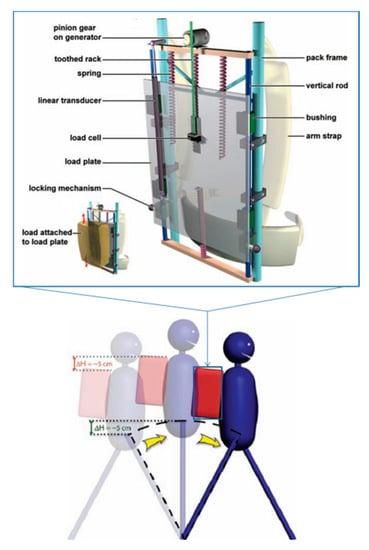 Human walking induced vibration energy can be collected nearly on every part of the human body, so the electric generator design has more flexibility. Studies conducted over the last few years mostly placed a harvester in a backpack carried by shoulders to recover energy [,,]. Such backpack was designed based on the assumption that a person walks like an inverted pendulum, in which the hip traces out an arc over an extended leg with a vertical excursion of 5 cm or so. With the prototype shown in Figure 5, power generation can reach a maximum of 7.4 W at the speed of 6.4 km/h when the participant is carrying 20–38 kg loads []. Additionally, the human walking-induced vertical movement of the load in the gravitational field is also a promising energy source. However, compared with mechanical vibration, human-induced oscillations are challenging for energy harvesting because of low-frequency, aperiodic, and time-varying characteristics [,].