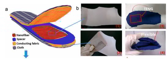 When carrying a triboelectric nanogenerator built inside the insole to harvest walking-induced energy, electricity can be generated as soon as the human walks. Based on the cycled contact-separation between a polydimethylsil-oxane (PDMS) film and a polyethylene terephthalate (PET) film, a simple fabrication and cost-effective triboelectric nanogenerator with outstanding performance was developed. During the test conducted in 10 s, the instantaneous maximum power value was nearly 1.4 mW by changing the resistor from 103 to 108 Ω []. The basic structure of such devices used to produce triboelectric energy and output the current is a thin film only nanoscale in thickness, so the generator can be made soft and transparent []. Furthermore, the approach to create the simple-to-fabricate, high-performance, wearable, and all-fiber triboelectric nanogenerator based insole with a composition of electrospun piezoelectric polyvinylidene fluoride (PVDF) nanofibers sandwiched between a pair of conducting fabric electrodes that effectively harvests energy from vibration caused by foot strikes during human walking was proposed, as shown in Figure 7 []. In previous research, the PVDF material together with nylon has proven to be very suitable for fabricating the fully self-powered and portable detection devices [].