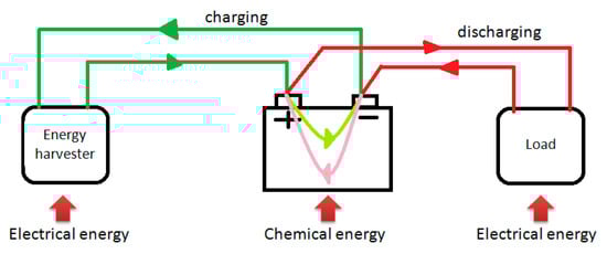 In the current research, energy harvested from human walking motion has to be stored in the form of electricity. Unfortunately, not enough effort has been taken on the issue within the research field of human walking induced energy harvest. Battery energy storage is not a new topic but still challenging in many applications. Attentions related to electric energy storage are mostly paid to the large plants, such as wind farms, because of frequent supply and demand fluctuations [,]. By contrast, energy generated by human walking motion is much less in quantity, so the energy storage efficiency should be given special attention. Apparently, the relatively low efficiency is the weakness of the battery because either charging for storage or discharging to power electronics is always accompanied by energy loss. As shown in Figure 8, energy is converted from electrical energy to chemical energy during charging and inversely during discharging. The charge and discharge efficiency of a battery usually falls into the range of 80% to 90%. Generally, a lithium ion battery has higher efficiency and power density, but it is significantly less compared with that of fossil fuels, of which the value is equal to about 1% [,,]. Furthermore, safety and environmental protection are also major problems in the case that the battery is embedded into the energy harvesting system and attached to the human body all the time []. Until now, such problems encountered in other applications where the battery is taken as a power source have not been solved effectively.