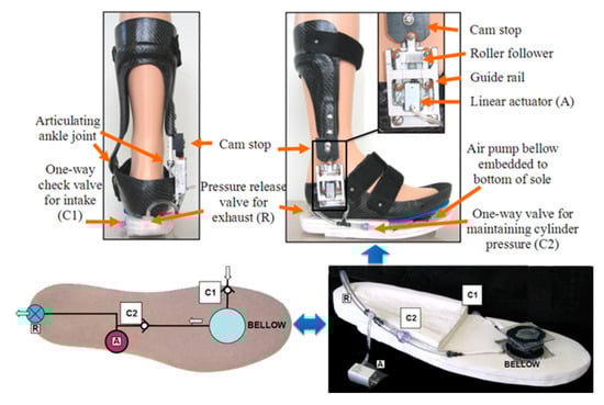 Seeking an alternative energy form for harvest and reuse is a promising solution to get a breakthrough in energy harvesting, especially for the wearable mechatronic systems like exoskeletons. A powered exoskeleton is basically a wearable walking robot developed for rehabilitation or physical augmentation of the wearer. It is usually powered by a system of electric motors, pneumatics, hydraulics, or a combination of technologies. Since fluid power is easier to transfer and control, its application of walking energy harvesting could be an ideal practice to perform energy saving on such robotic systems []. The pneumatic system has functioned in such a biomechanical system of small power as self-powered ankle-foot orthosis by generating power with an air pump embedded into the sole [,]. As shown in Figure 11, with a simple pneumatic circuit energy delivered by air compression was captured when the foot pressure was acting on the sole during walking.