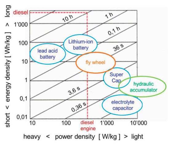 - Energy storageEnergy storage is complicated in an electrical system, and it takes a long time to charge the battery. The electric signal transmitted during the energy conversion process has to suffer from rectification before electric energy storage []. The hydraulic power system, by contrast, is characterized by the combination of energy conversion and storage with an accumulator to realize easily. Furthermore, the consistent use of regenerative energy is particularly significant to the efficiency improvement. Hence, compact and powerful energy storage devices are required at any time. Comparisons of electrical, mechanical, and hydraulic energy storage devices illustrated in Figure 14 show that the classical hydraulic accumulator has very good superiority []. The energy efficiency of hydraulic drives has increased dramatically over the past decades, taking advantage of its easily implemented energy regeneration [,]. Similar to the bulky frame of the battery, the fluid energy storage device is usually not a lightweight component. It is critical, especially for mobile application, and should be improved by reducing the weight. With the emerging new material and the advanced manufacturing technology, such components with a mass reduction of more than 50% compared to the metallic structure have been reported []. This achievement is very exciting for the current fluid power system and makes it possible to expand the application scope of the fluid energy storage device.