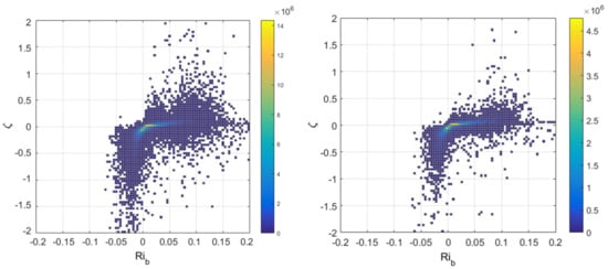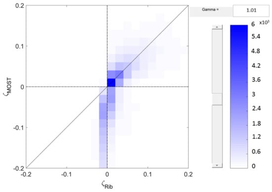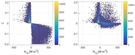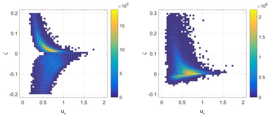 In this study, we performed several types of approaches to estimate such as direct measurements of fluxes by using ultrasonic sensors, by using bulk Richardson number, and parameters, and wind shear exponents. MOST with the ultrasonic measurements gives the best results, so it is selected as a reference. Firstly, and distribution is shown in Figure 2. This histogram emphasizes the pattern of these two parameters for the limited range—to avoid extreme cases. was applied for the . The bin color is related to data frequency (the lighter it becomes, the more frequent it becomes). Since the time scale is a distinctive feature for turbulent fluxes, we performed the analyses for two different cases (10 min and 30 min).