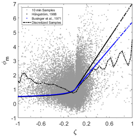 where is eddy diffusivity ratio, . The name of the profile comes from the shape of the data distribution, where: depending on the stability region, its shape is approximated as those said profile functions. Dimensionless wind shear can be expressed as , while dim-less lapse rate is expressed as under unstable air condition, where and are the fitted parameters of the case studies. For the stable region, both of them were stated by a linear formula. Other expressions, such as and that is constant, are also suggested [5,17]. In a SHEBA case study, profile functions are stated as power of values for the extreme cases [12]. It concluded that , are for very extreme cases. Integrating and universal stability term, , is obtained, which is the key parameter merging profiles (velocity and temperature) and air stability.