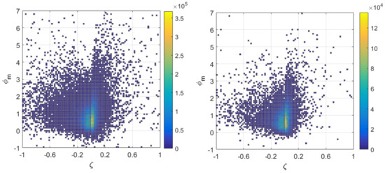 How the friction velocity is affected by stability can be seen in Figure 5. Both figures agree with the results that friction velocity becomes maximum in a neutral region and gets smaller under the instability conditions. The most frequent value of the is found as and in MOST and , respectively. It can be observed that, after a near-neutral region, the distribution doesn’t continue within the unstable region in Figure 5 (right). However, both figures show the same characteristics within stable and neutral regions. Particularly, in the near-neutral region, the most recurrent value is almost identical for both of them. Even it is given as and near , the range of distribution is quite large with respect to the rest of the values, which shows that the covariance of kinematic flux reach their maximum here. In addition, all of the velocity components vary on a large scale, where can reach almost 2 m/s. In the convective layer, the vertical velocity becomes dominant, and horizontal components get undetectable by increasing upward air motion. Thus, the covariances of the parameters also get decreased and result in small . The same tendency occurs within the stable regime where the horizontal components are much larger than the vertical speed component, which takes us to the same result of finding small values. The additional observation is as given previously; the distribution ends in a near-neutral or weak convective regime where the is near –0.05 estimated by . This fact enables us to say that the suggested method can detect an unstable region up to the weak convective layer that ends near . However, both methods give a very similar distribution pattern up to that point. can also be used in estimation of the profile functions that are dimensionless momentum and heat parameters, and . All of these parameters mentioned are linked to each other by empirically, Equation (5). If the velocity and temperature gradients are known, dimensionless momentum and heat can be calculated. To calculate those parameters, we use wind speed and temperature gradients, as given in [8].
