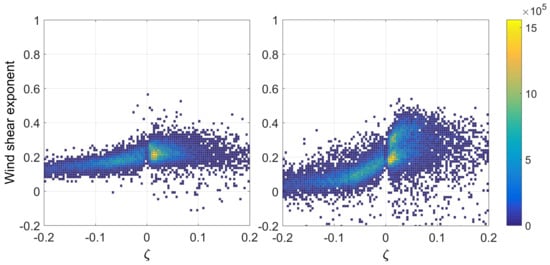 It is not enough to show the relationship between and with only average values since extreme values can alter the results even when their frequency is small. Therefore, Figure 7 provides a more insightful perspective by giving the distribution of the two parameters for two different time scales. It reveals that is collected between zero and one as the goes to zero for both time scales. Another observation is that values increase much rapidly within the stable region compared to the unstable one in both time scales. The wind shear exponent is one of the recommended methods, and can be used when the temperature measurements are not available. Exponential parameter is calculated between 10–52 m and 30–76 m, and is compared to for 30 min samples.