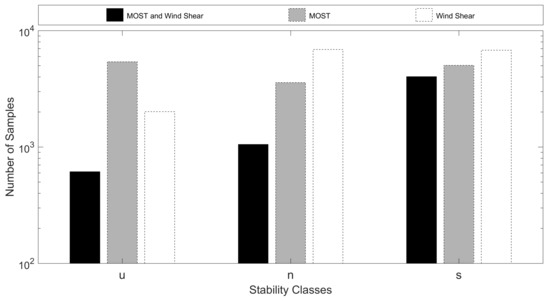 In the unstable regime, a shear exponent underestimates the sample numbers with respect to the MOST and the agreed number of the samples by both methods near 600. The MOST underestimates the sample number in the neutral regime where the agreed number is 1000. The agreement within the neutral regime is higher than the one from an unstable regime. Final regime, stable region, gives the most consistent results for both methods. The sample number from both methods’ intersection is almost equal to the ones obtained by MOST. Figure 9 gives all the sample numbers where the density is not take into account. Thus, depending only on this illustration and making a judgement is not easy. Even the observations in Figure 9 show disagreement in the neutral region; this is originated by not considering the frequency again. On the contrary, Figure 8 indicates that the densest part of the distribution is located near the zero. Therefore, both of the Figure 8 and Figure 9 are used to conclude that a shear exponent can be used in stability analysis within the neutral and stable regimes.