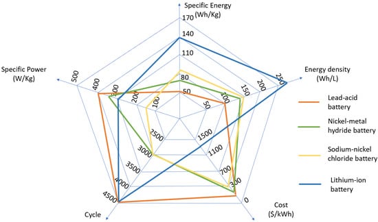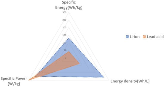 Lithium-ion batteries captured the market for energy storage and movable electric products after being first commercially produced by Sony Company in 1991. They simultaneously have a large power storage capacity, small size and are lightweight [48]. Compared with other batteries shown in Figure 4, the lithium-ion battery has significant advantages in terms of specific energy and energy density.