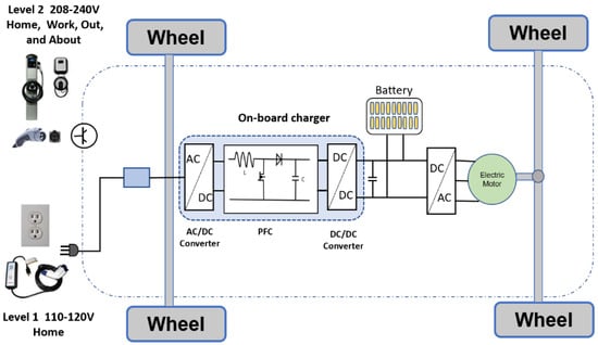 The conductive charging scheme allows the physical connection of charger and vehicle [62]. An unmediated contact occurs in power transferring from power supply to battery. It consists of alternating current (AC)/direct current (DC) and DC/DC converters with some power factor correction (PFC) and can be classified as an on-board or off-board charger [63]. The charger is the connection of energy transmission. The charging process is the process of transferring the electricity from the power grid to the EV battery. Since EV batteries can only be charged with DC, a charger is required for converting AC from the power grid into DC. Figure 5 shows the basic layout of an on-board battery charger.