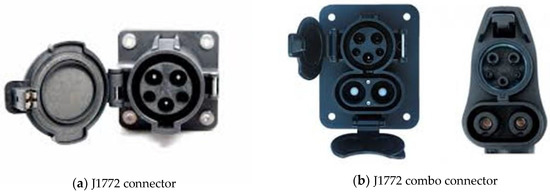SAE J1772 is also known as a “J plug”, which became a standard piece equipment in the U.S. market. Figure 6 shows the SAE J1772 and the new J1772 combo connector, which can be used for both AC and DC charging. The SAE J1773 supplies the minimum interface compatibility demands for EV inductively coupled charging in the same regions. This kind of inductively coupled charging is expected to transfer energy at higher frequencies than power frequencies [95]. SAE J2954 was published in 2017 and provided the first worldwide standard for wireless power transfer for EVs with an 11-kW power level. Wireless charging with an 11-kW power level is a milestone of commercialization for EVs.