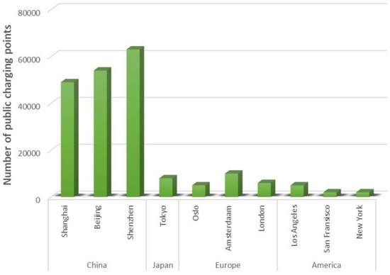 In relation to the “chicken-and-egg” problem for EV implementation, charging infrastructure has been promoted by governments in many countries, especially those with high EV stocks. The availability of access to public charging infrastructure differs widely at regional level [144]. In the U.S., charging infrastructure was initially established with the support of the American Recovery and Reinvestment Act of 2009, which supplied federal funding through some EV infrastructure programs to build up about 18,000 public charging points in the U.S. between 2010 and 2013. Since then, different federal, state and private agencies have begun to invest in the construction of charging infrastructure [144]. In Europe, the stakeholders in charging infrastructure included governments, auto manufactures, energy companies and private charge-point providers. Norway, as the EV sales market leader in Europe, has faced challenges involving charging infrastructure. Their government played a key role in the construction of charging infrastructure and will continue to invest in the field. To decrease Green-House Gas (GHG) emissions, a Norway agency, Transnova (also called “Enova”) has steadily funded Norway’s charging infrastructure with six million Euros since 2009. The Office of Low Emission Vehicles (LOEV) of the UK government funded the buildout of public charging station by covering 75% of the hardware costs through a set of programs. In addition, as part of their Road Investment Strategy, the UK planned to build charging points every 30 km along the major road network [144]. In the Netherlands, some kind of charging network was already in place in several cities. Much of the initial charging infrastructure was funded by ELaadNL, a foundation associated with six energy network companies in the Netherlands. Moreover, the Netherlands government has invested over 16 million Euros in construction of charging infrastructure since 2011 to ensure the availability of charging points for all residences [144,147]. In Asia, the expansion in the number of charging points in China has been impressive in recent years, especially in Shanghai, Beijing, and Shenzhen, which are pilot cities funded by the central government. These cities aim to have one charging point for every eight EVs and wish to establish high density charging networks in downtown areas. The Japanese government have funded the installation of charging stations around various cities and across their highway road network since 2013 through their “Next Generation Vehicle Charging Infrastructure Development Promotion Project” [144,146]. More than 7500 stations have now been included in Japan’s charging network, which is constructed by the Japanese Bank, auto manufacturers and power companies. With the sustained promotion of governments, preliminary charging networks have been built up in different countries and regions, particularly in metropolitan areas. Figure 7 [144,147] shows the current status of public charging points in several metropolitan areas around the world.