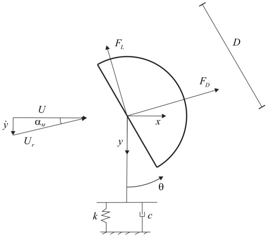 For modeling purposes, we consider the simplified case of a prismatic galloping body elastically mounted in such a way that oscillations take place only on the transverse direction of the flow and is actively forced to rotate along its longitudinal axis with a prescribed rotation law (see Figure 1). The body is linked to a harvester system in order to extract useful energy. For simplicity, a generic linear viscous damper is considered here to model the harvester system. This can be a good approximation, for example, for electromagnetic conversion when the frequency of oscillations is low so that the effect of the inductance is negligible. In this case, the mechanical effect of the harvester is equivalent to that of a viscous damper, as shown briefly in the Appendix B or in [15,17]. Note that only energy is harvested from the transverse motion. Appropriate balance between inertia, stiffness, backlash force from the harvester, and fluid force gives the following ordinary differential equation for the transverse displacement y: