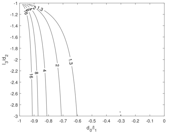 Oscillations are only possible when , thus the initial reduced velocity at which galloping oscillations are expected is recovered . As increases for larger values of (see Equation (14)), the initial reduced velocity where galloping starts is reduced as is increased. Noteworthy, for high enough negative values of , takes a negative value and galloping is avoided, which are interesting results from the practical side when the interest is to protect a structural element against Transverse Galloping.