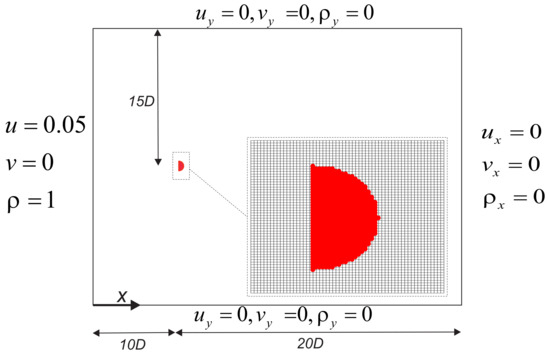 The computational domain and boundary conditions are shown in Figure 4. The diameter of the D-Section has 40 lattice points (observe that the number of lattice points for the diameter of the cylinder is linked to the Reynolds number , kinematic viscosity , and inflow velocity U (free of turbulence), since ) and the computational domain chosen is 40D × 30D, giving a size of 1600 × 1200 lattice points. The left boundary was set to be a velocity specified inflow boundary condition with constant velocity profile U. To simulate the incompressible condition, the Mach number must be low enough; to this end, the inflow velocity U was set to 0.05 (the velocity of sound is so that the Mach number at the inflow is and is of order 0.01). The rest of the outer computational boundaries were considered outflows. For the boundary conditions on the body, a no-slip boundary condition has been applied that is fluid velocity equal to body velocity (see Appendix A for details about how physical boundary conditions are implemented).