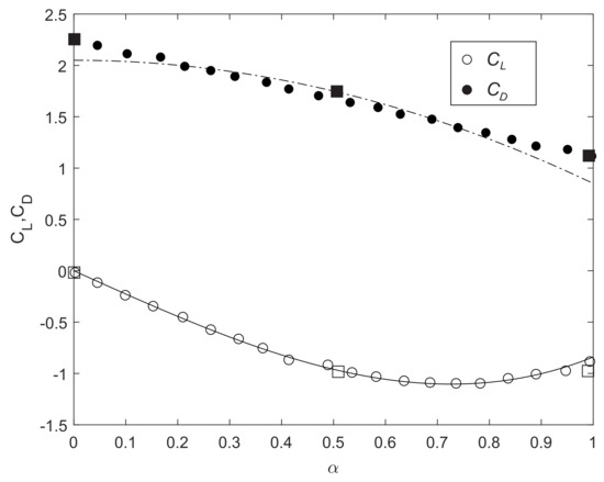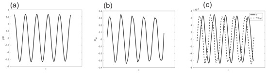 First of all, static numerical simulations were carried out to compute static drag and lift coefficients. To this end, no-motion was imposed () and a fixed angle of attack ( fixed). Figure 5 shows the dependence of the lift and drag coefficients with the angle of attack from the numerical simulations carried. As said before, the Reynolds number was 100. In addition, results from [20] are presented for validation purposes, as well as polynomial fitting curves obtained by least squares minimization (see Equation (5); , and ).