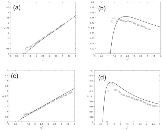 Normalized amplitude of oscillations and efficiency as function of the reduced velocity for (a,b) and (c,d). White circles stand for results from the Lattice Boltzmann Method computations and solid lines from the quasi-steady model.