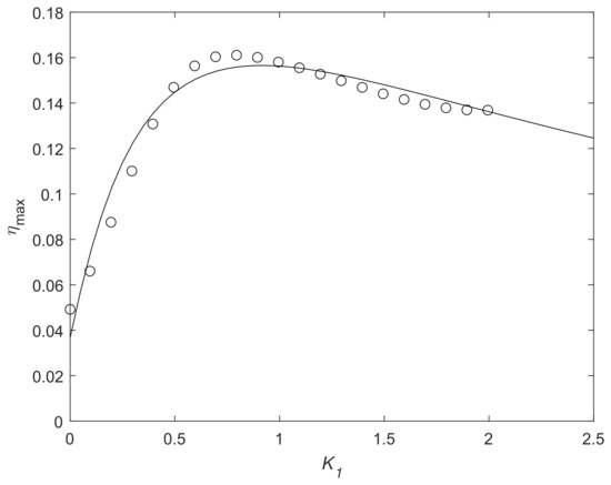 The maximum efficiency can be found by differentiating Equation (22) with respect to and equating to zero: