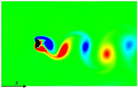On the other hand, in Figure 11, the wake after the body with actuation () exhibits a quite different flow pattern. Only independent vortices are formed at the point of maximum displacement during the cycle of oscillations when the body changes direction (maximum acceleration). The near-wake behind the body shows bounded vorticity which only breaks into an independent vortex downstream. This could be related to the fact that, through orientating the galloping body, it becomes much less bluff and the flow remains further attached.