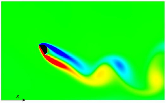 For a better understanding from the physical point of view, the flow pattern (vorticity) around the galloping body is presented here for the case without actuation () and for a particular case with actuation (), reduced velocity 4 and . In Figure 10, the wake structure after the body without actuation exhibits characteristic large-scale vortices being shed independently from the body’s oscillation at its own frequency. Thus, the wake pattern resembles that of a wave as each vortex is shed at different points of the cycle of oscillation following the Strouhal frequency of vortex emission for the body at rest (, where is the characteristic Strouhal number of the cross-section and the frequency of vortex shedding); thus, there is no synchronization between vortex shedding and oscillation.