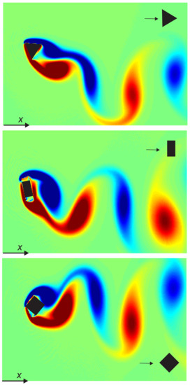 Vorticity contour with actuation () for a reduced velocity of , mass ratio is 10, and damping parameter for equilateral triangle, rectangle (1:2 side), and 45° rhombi. It is shown the vorticity field when the body is at and going downwards.