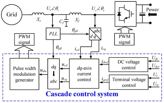 As shown in Figure 1, the DC power stabilized by the capacitor is inverted by the GVSC, and the inverter power is fed into the grid through the filter reactance []. The pulse-width modulation signal for inversion is generated by the phase-locked loop (PLL) and the cascade control system. The PLL is used to capture the grid voltage to provide a reference phase for the cascade control. Its application can ensure that the GVSC operates synchronously with the grid. The cascade control system is based on a proportional-integral controller with the current signal as the inner loop control target and the voltage signal as the outer loop control target. This system can control active and reactive power independently. In cooperation with DC voltage control and d-axis current control, the GVSC can operate stably and maintain the power balance of the AC and DC sides. In cooperation with the terminal voltage control and q-axis current control, the GVSC supports the reactive power to the grid.