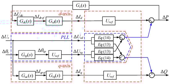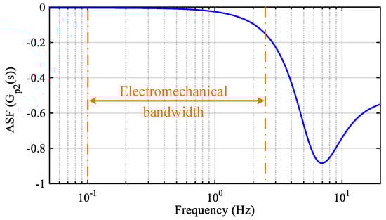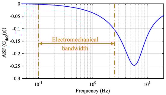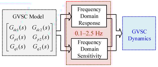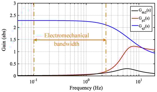 When the EO of the power system is determined, i.e., the input of the model is known, the frequency responses of Gp1(s), Gp2(s), Gq1(s), Gq2(s), Gdc1(s), and Gdc2(s) in the electromechanical bandwidth can reflect GVSC response during an EO. Thus, the transfer function matrix is analyzed through the frequency domain method, as shown in Figure 3. However, the time scale of the PLL should be close to the electromagnetic bandwidth []. Therefore, the response of the GVSC is mainly affected by Gdc2(s), Gp2(s), and Gq2(s).