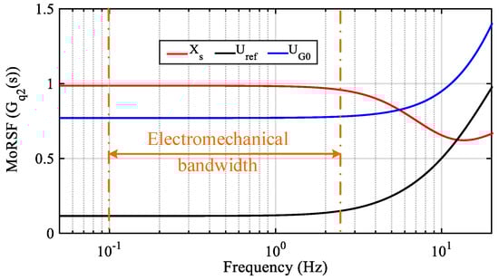 Figure 7 shows the MoRSF of Gq2(s) with respect to Xs, Uref, and UG0. Overall, they rarely change with the frequency in the electromechanical bandwidth. The MoRSF of Gq2(s) with respect to Xs is maintained at approximately 0.98, which is the largest, followed by that of UG0, which is 0.25 less than that of Xs; the smallest is Uref, remaining at approximately 0.2.