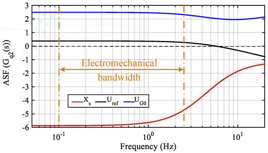 The ASFs of Xs, Uref, and UG0 are calculated to further analyze the effects of their changes on the reactive power response of the GVSC, as shown in Figure 8. In the electromechanical bandwidth, the ASFs of Uref and UG0 are respectively maintained to be greater than 0 at approximately 0.3 and 2.5, respectively. Hence, their increase will enhance the reactive power response of the GSVC during an EO. Although the ASF of Xs increases with incremental frequency, it is always less than 0 in the electromechanical bandwidth. Hence, the increase in Xs will weaken the reactive power response.