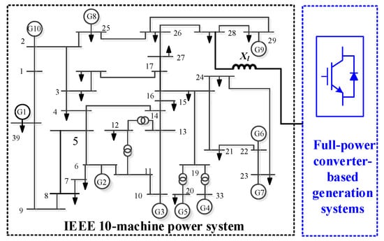 This study used the numerical integration method to calculate the time domain trajectory of the DC voltage and AC power of a GVSC during an EO. The power system EO was produced by performing a small disturbance in the IEEE 10-machine power system. The full-power converter-based generation systems in reference [] were used to analyze GVSCs’ dynamic behavior. The parameters of the GVSC were consistent with those in Table 1. If the network structure and line parameters of the power system were not changed, then the grid strength can be changed by adjusting the transmission line reactance Xl, as shown in Figure 9.
