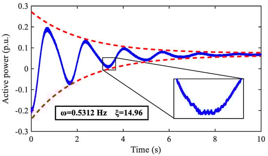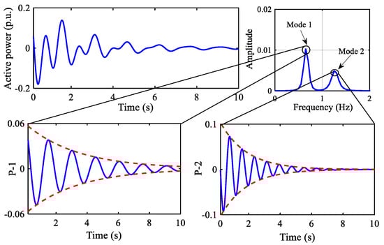 The oscillation component of active power from bus 28 to 29 caused by a small disturbance is shown in Figure 10. This component is used to reflect the power system’s electromechanical behavior. The FT spectrum indicates two oscillation modes in the active power signal, namely, P-1 and P-2. The adaptive local iterative filter decomposition (ALIFD) algorithm was utilized to identify the oscillation’s characteristic parameters (frequency and damping ratio) []. As shown in Table 2, the frequencies of P-1 and P-2 were 0.6579 and 1.2651 Hz, respectively; both values were within the range of the electromechanical bandwidth. The damping ratios of P-1 and P-2 were 6.89% and 7.53%, respectively.