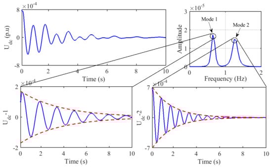 The oscillation component of the DC voltage of a GVSC is shown in Figure 11. Similar to the active power from bus 26 to 27, the DC voltage exhibits a declining trend and comprises two oscillation modes. According to the ALIFD parameter identification results shown in Table 3, the low-frequency component in the DC voltage, Udc-1, had an oscillation frequency of 0.6607 Hz and a damping ratio of 6.73%; these values were similar to those for P-1. The high-frequency component in the DC voltage, Udc-2, had an oscillation frequency of 1.2714 Hz and a damping ratio of 7.24%; these values were similar to those for P-2.