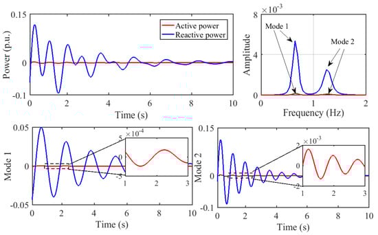 The oscillation trajectory of the power of the GVSC is shown in Figure 12. The active power and reactive power from the GVSC to the grid comprised two oscillation modes. The oscillation parameters identified by the ALIFD algorithm are shown in Table 4. In active power, the oscillation frequency of mode 1 was 0.6499 Hz, and the damping ratio was 6.63%; the oscillation frequency of mode 2 was 1.2425 Hz, and the damping ratio was 7.79%. In the reactive power, the oscillation frequency of mode 1 was 0.6513 Hz, and the damping ratio was 6.94; the oscillation frequency of mode 2 was 1.2688 Hz, and the damping ratio was 7.51. Although the active power and reactive power had frequencies and damping ratios that were similar to those of the power system’s EO, the time domain trajectory denotes that the active power response of the GVSC is much weaker than the reactive power response regardless of the mode (i.e., mode 1 or mode 2).