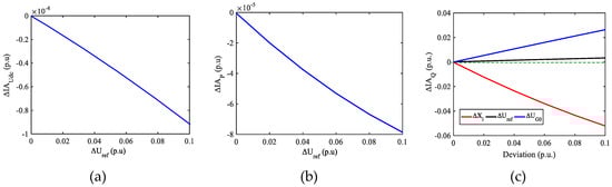 Figure 13 shows the relationship of the deviation in the parameters with the deviations in the IAs of the DC voltage (ΔIAUdc), active power (IAP), and reactive power (ΔIAQ). The ratio of ΔIAUdc to ΔUref, as well as the ratio of ΔIAP to ΔUref, is less than 0. The ratios of ΔIAQ to ΔUref and the ratios of ΔIAQ to ΔUG0 were greater than zero, as opposed to the ratio of ΔIAQ to ΔXl. Given that ΔXl, ΔUref, and ΔUG0 have the same unit, the influences of Xl, Uref, and UG0 on the reactive power response of the GVSC can also be compared in Figure 13. For the same ΔXl, ΔUref, and ΔUG0, the variation in reactive power caused by ΔXl was the largest, followed by that caused by ΔUG0 and that caused by ΔUref. The dynamic response characteristics of GVSC in the time domain were consistent with the results of the frequency domain analysis.