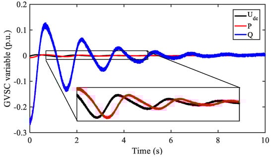 The oscillation component of the active power from bus 7 to 9 is shown in Figure 15 In the electromechanical bandwidth, an interarea mode with a frequency and a damping ratio of 0.5312 Hz and 14.96%, respectively, was extracted. Figure 16 shows the oscillation component of the DC voltage and AC power of the GVSC. The active power response of the GVSC was much weaker than its reactive power response. The characteristic parameters of the GVSC’s port variables were extracted by the ALIFD algorithm, as shown in Table 5. The oscillation frequencies and damping ratios of the DC voltage, active power, and reactive power were 0.5322 Hz and 14.33%, 0.5267 Hz and 15.21%, and 0.5338 Hz and 14.89%, respectively. All of these oscillation characteristic parameters were similar to those in the interarea mode.