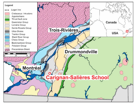 The Carignan-Salières elementary school is located on the south shore of the St. Lawrence River near Montreal (Figure 1) and was built above the Nicolet Formation. This sedimentary rock formation belongs to the Loraine Group, known to have a thermal conductivity on the order of 3 W m−1 K−1 [12,13,14], and is part of the St. Lawrence Lowlands sedimentary basin [15]. From a structural perspective, the St. Lawrence Lowlands are characterized by a series of normal faults extending from the southwest to the northeast, and which dip toward the southeast [16,17].