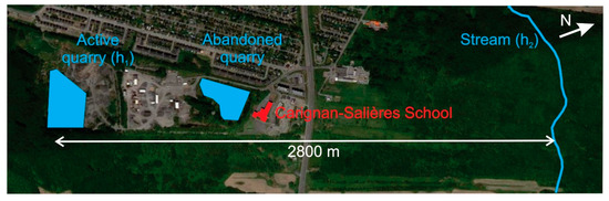 The Nicolet Formation, hosting the school GHE field, consists of sequences of silty gray shale, with interbedded sandstone, siltstone and limestone [18]. Gabbro dykes, which are observed in the school area, are oriented EW and cut the stratigraphic sequence [19,20,21]. Most of the dykes are sub-vertical and have a varying thickness of 0.5 to more than 20 m [22]. One of the two quarries near the school is currently active and water is pumped irregularly (Figure 2). Regional aquifers in this area of the south shore of the St. Lawrence River are hosted in fractured rocks. The direction of groundwater flow at the site is oriented toward the active quarry where water is being pumped. The average hydraulic conductivity of the host rock reported in the area is 10−5 m s−1, varying from 3.2 × 10−7 to 1.6 × 10−4 m s−1, and the annual net recharge of the aquifer is approximately 100 mm y−1 [23]. The town of Carignan has a humid continental climate with an annual average air temperature of 5.9 °C and an amplitude of 30 °C [24]. The heating period is mostly from October to June while the cooling period is from July to September.