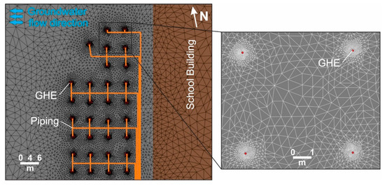 The surface area of the numerical GHE model is 500 m × 500 m and extends from ground surface to a depth of 300 m, divided into 6 layers of 50 m each. The same lithological characteristics of the subsurface, such as hydraulic conductivity, thermal conductivity of both fluid and solids, as well as porosity are assigned to the six layers that have a different initial temperature based on the geothermal gradient. The model mesh consists of 3D triangular prismatic elements for a total of 195,720 elements and 114,450 nodes. A 2D horizontal-plane mesh was built and then extended in 3D to cover the entire domain (Figure 3). Each GHE was surrounded by 6 nodes. Thirty-one GHEs were added to the domain, following the same layout as at the Carignan-Salières elementary school. In the plan view, the triangular mesh dimensions are up to approximately 4 m at the boundaries of the model (Figure 3), decreasing to 0.06 m around each GHE.