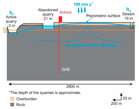 Field observations combined with GHE drilling reports allowed to define a geological cross-section used as a conceptual model (Figure 5). The 2800 m cross-section is bounded by a stream and the active quarry that are considered constant-head hydraulic boundaries defining the water table at these locations. The thickness of the unconsolidated sediment cover was determined from well logs of the bore field [26]. The abandoned quarry closest to the school is 189 m down-gradient from the GHE field, while the active quarry is approximately 1 km down-gradient. The water level depth in the abandoned quarry was 21 m above sea level (asl) during the field work. Water is pumped irregularly in the active quarry to maintain the groundwater level below the excavation, which affects the local groundwater flow regime. The water level in the active quarry was measured at −3 m asl, but can vary by a few meters.
