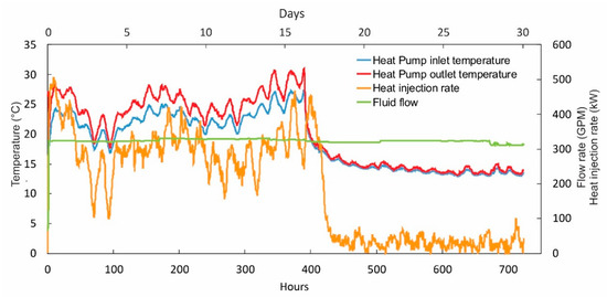 The heat injection test was carried out at an average heat injection rate of 305 kW for the entire bore field or 9.8 kW per borehole (Figure 6). The total average flow rate was 39.9 L min−1. The injection period lasted 406 h with GHE water temperature fluctuating between 15 °C to over 35 °C. Monitoring of the temperature recovery, where the fluid is kept circulating in the GHE field without heat injection, lasted 318 h and the GHE water temperature eventually recovered to about 13 °C.