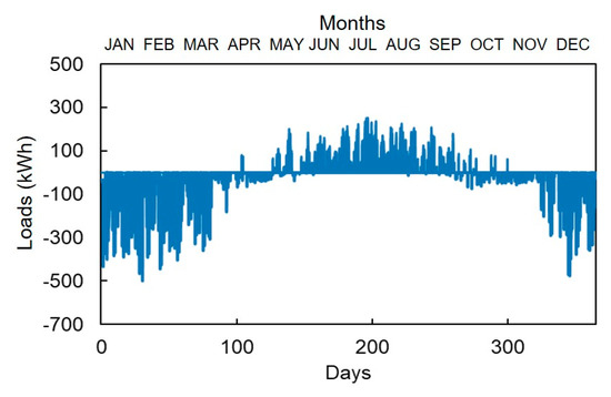 The building simulation using eQuest revealed that the total annual heating energy consumption of the school building is 171 MWh and the total cooling energy consumption is 119 MWh for a regular year of operation. The peak heating load of 494 kW occurs in January while the peak cooling load of 253 kW occurs during July. The building loads were converted to ground loads using Equations (1) and (2) assuming a COP of 4.7 and 4.1 in heating and cooling modes, respectively (Figure 7). The COPs were chosen according to the heat pump specifications provided by the manufacturer and represent average conditions. Heating loads are greater than cooling loads, which makes the ground loads unbalanced and can affect the long-term thermal response of the system.