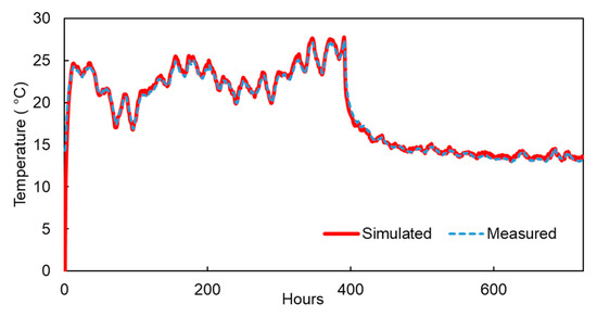 The total duration for the calibration simulation was 724 h, which corresponds to the duration of the heat injection test, including the heat injection and the thermal recovery periods. Calibration parameters were adjusted one at a time (Table 3) until the calibrated model best reproduced the GHE outlet temperature with a maximum error of 2% (Figure 8). Calculation time using a workstation with a 3.3 GHz-core processor and 32Gb RAM was about 30 min for the calibration simulations.