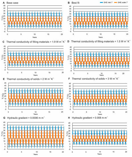 The eight simulation scenarios used to evaluate the long-term operating GHE temperature at the Carignan-Salières elementary school were based on field observations and calibration results, varying key parameters one at a time to determine the impact of associated heat transfer mechanisms (Table 4). The start time of the simulation was the month of September, when the GHE system was put in operation. Each simulation took 5 days using the same workstation as reported above for the calibration simulations. Scenario A is a base case scenario, considering measured data for the thermal conductivity of the solids and the borehole filling material as well as hydraulic conductivity of the host rock reported in the literature [23] and a moderate hydraulic gradient, when compared to the hydraulic gradient measured during the field work. Scenario B was defined according to the best-fit parameters identified with the calibration and has a small change of solids thermal conductivity when compared to Scenario A. Only the thermal conductivity of the borehole filling material was changed in Scenarios C and D with respect to the base case. Scenarios E and F focused on thermal conductivity of the host rock solids, while Scenarios G and H were run to verify the influence of groundwater flow with a change of hydraulic head at the eastern and western boundaries of the model (Figure 4).