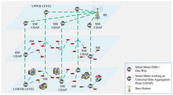 An initial solution that addressed the scalability feature of a multi-hop AMI network was presented in [], which considered a growing population of SMs, a restricted capacity and chargeability in the UDAPs, as well as the target coverage of the network. However, the authors did not consider the wireless link capacity in the problem, which made it difficult to assess the applicability of restricted wireless technologies to achieve a reduced deployment cost. Furthermore, with a large population of smart meters, it becomes necessary to provide the re-routing of information any time a link becomes congested or when it fails.