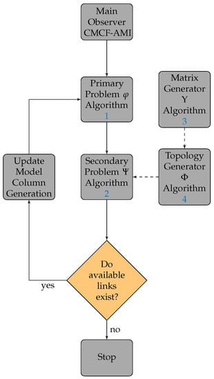 The main observer verifies the objective values of the primary problem (see Algorithm 1). Algorithm 1 employs the revised simplex method to obtain the column generation. The secondary problem (see Algorithm 2) is responsible for testing several topologies to find the congested links and defining other options that are feasible. In addition, the secondary problem requires two additional processes: one responsible for generating the matrices and weights for capacities, costs, distances, and links, presented in Algorithm 3, and the other is in charge of delivering the new topologies to the secondary problem, presented in Algorithm 4. The main observer keeps verifying until the objective function meets an acceptable minimum.