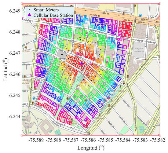 The population of smart meters is related to the need to have smart metering by utilities. In this sense, the present work incorporated a growth rate in the analyzed scenarios, which could be modified according to the amount of gradual investment and the time for the deployment that a utility could have. The scenario had an area of 0.319 km, with a population of 1024 homes, where the smart meters would be located; this scenario included approximately 34 homes for each neighborhood. Therefore, the experimental model had an incremental growth of 32 smart meters to show the growth that could be modified according to the requirements of the utilities and was determined by N = [32,64,96,128,160,192]; however, the scenario included a radial and non-sectorized deployment to achieve greater coverage for each wireless device. The scenario included some capabilities for each device with wireless technology determined by C = [10,20,100], which were equivalent to the capacity of a one-way smart meter, a smart meter that could behave like UDAP, and the base station or UDAP. The radio incorporated for a cellular base station radio or UDAP had a 100 meter range, and the WiFi radio had a 40 meter range. The OpenStreetMap site was used to obtain the OSM file of the scenario presented of Laureles neighborhood, Medellín, Colombia, and linked to Matlab R2019b. A PC with 64 GB of RAM and an Intel Xeon processor at 2.90 GHz was used.