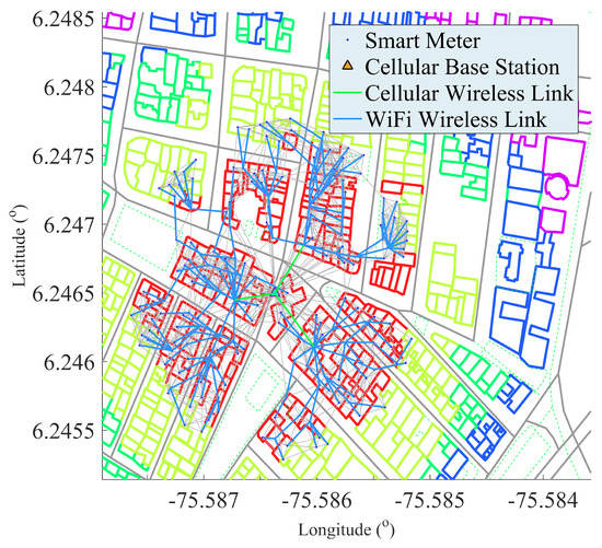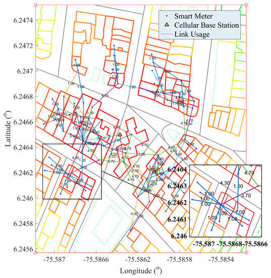 In this section, we present the results generated by the CMCF-AMI heuristic model. Besides solving the problem of routing in a heterogeneous wireless network, we identify the paths taken by flows of information from the smart meters to the cellular base station. The scenario in the evaluation corresponded to a real map with conglomerates of N installed smart meters (see Figure 3 for an example of ). The N value may change depending on the needs of the electric distribution company. The scenario considered a radial deployment in order to take advantage of the coverage radius of a typical cellular base station.
