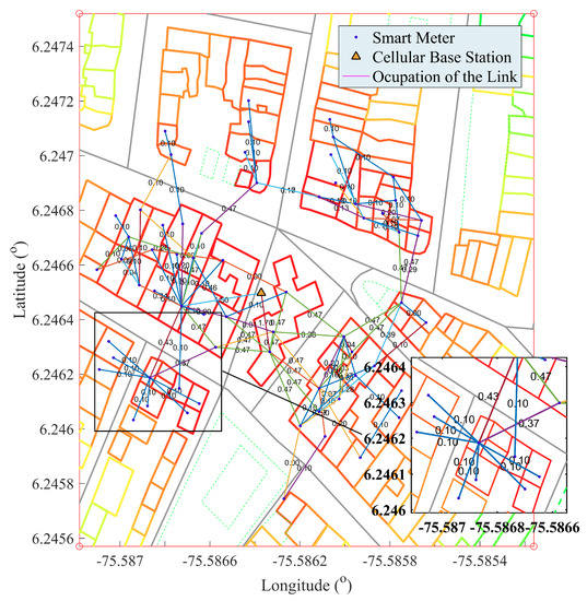 In Figure 5, one can see the occupation of each link with the flows of each of the routes that they took as optimal in the process of transmitting information from the smart meters to the cellular base station. In Figure 6, we illustrate the percentage representing the use of the links.